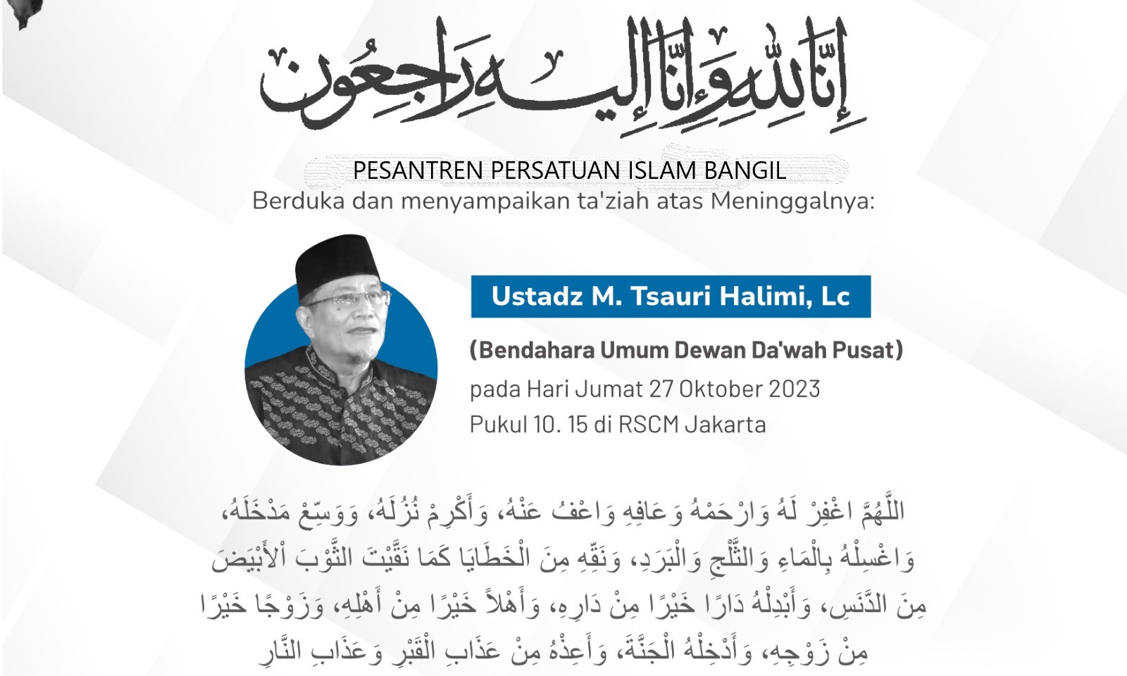 Atas wafatnya Ustadz M. Tsauri Halimi, Lc. (Bendahara Umum Dewan Da’wah Pusat) pada pukul 10. 15 hari Jumat 27 Oktober 2023 di RSCM Jakarta.