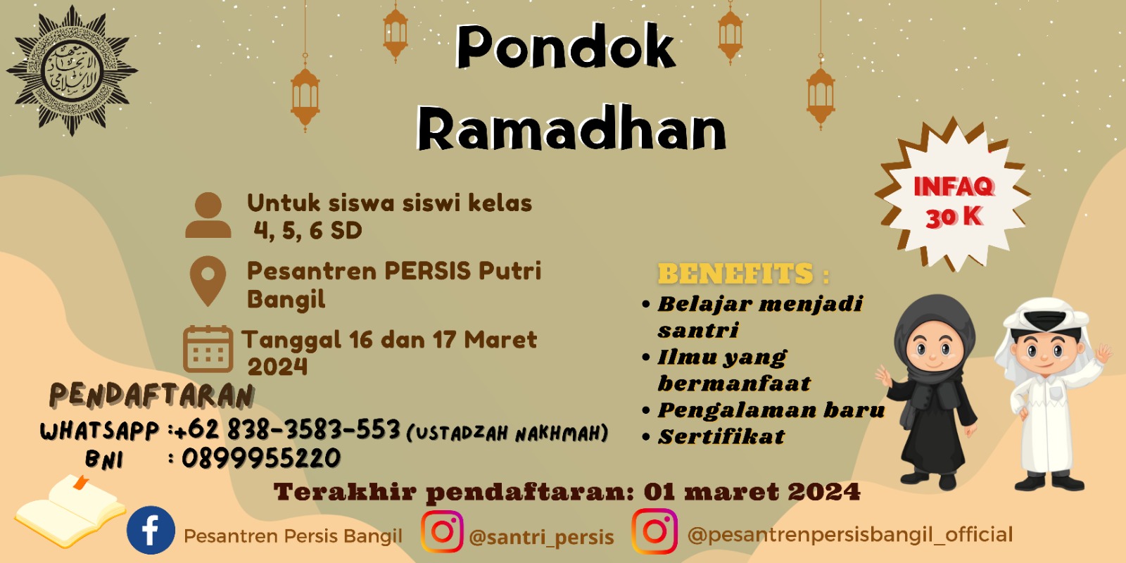 Pondok Ramadhan kembali dibuka pendaftarannya. Kali ini tahun ketiga pelaksanaan Pondok Ramadhan Tahun 1445 H. Pembina kegiatan, Ustadzah Mumtazah AQ., dan Ustadzah Imas Masyithah menyampaikan bahwa tahun ini ketua diamanahkan kepada Aisyah Intan Zhafira. Santri asal Sidoarjo ini dipercaya menjalankan roda organisasi da’wah sebagai pelaksana. Tentu tugasnya sejak mempersiapkan, sosialisasi, pelaksanaan, hingga evaluasi dan laporan pelaksanaan.