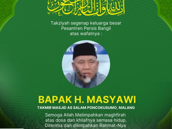 Segenap Keluarga Besar Pesantren PERSIS Bangil memanjatkan do’a memohon ampunan untuk Bapak H. Masyawi Ketua Ta’mir Masjid As Salaam Poncokusumo, Malang. Yaa Rabb muliakanlah ia di sisi-Mu. Berikanlah ampunan-Mu. Luaskanlah..