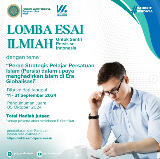 essai ilmiah adalah karya tulis yang dibuat untuk memperdalam topik yang sedang dibahas. Tema lomba kali ini adalah “peran strategis pelajar persatuan islam (persis) dalam upaya menghadirkan islam diera globalisasi”. Lomba ini juga menentukan 4 subtema, yaitu; Dakwah, pendidikan, sosial budaya, dan ekonomi. Lomba ini diadakan oleh PCI mesir. Jumlah total hadiah jutaan rupiah, dan setiap santri / santriwati yang berpatisipasi akan mendapatkan e-sertifikat. Santri yang mengikuti lomba tersebut berjumlah 42 orang, yang dibagi menjadi 10 kelompok.