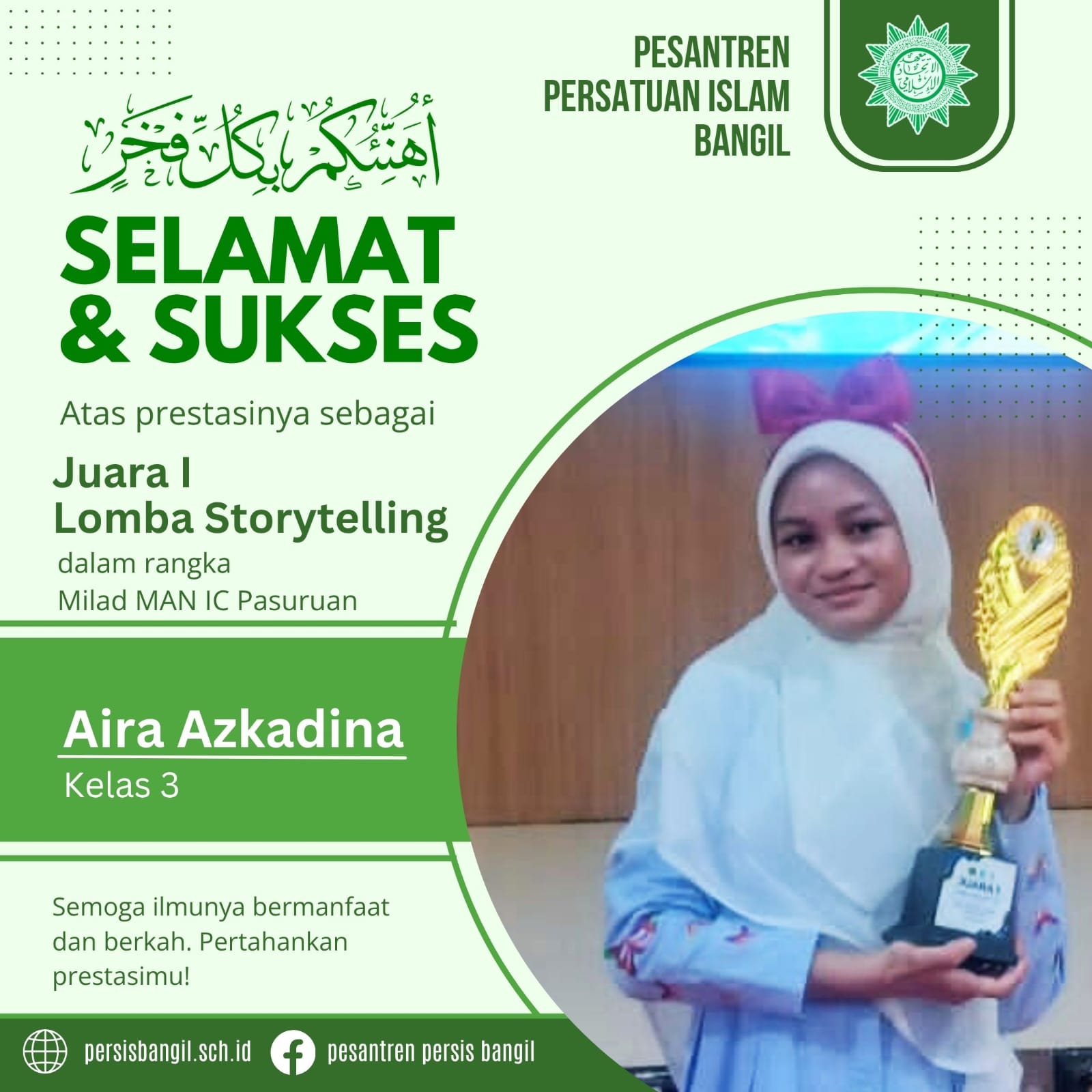 Selamat atas keberhasilan Aira Azkadina Faliha asal Sidoarjo (Kelas 3) yang telah meraih Juara 1 Story Telling di Milad MAN IC Pasuruan!