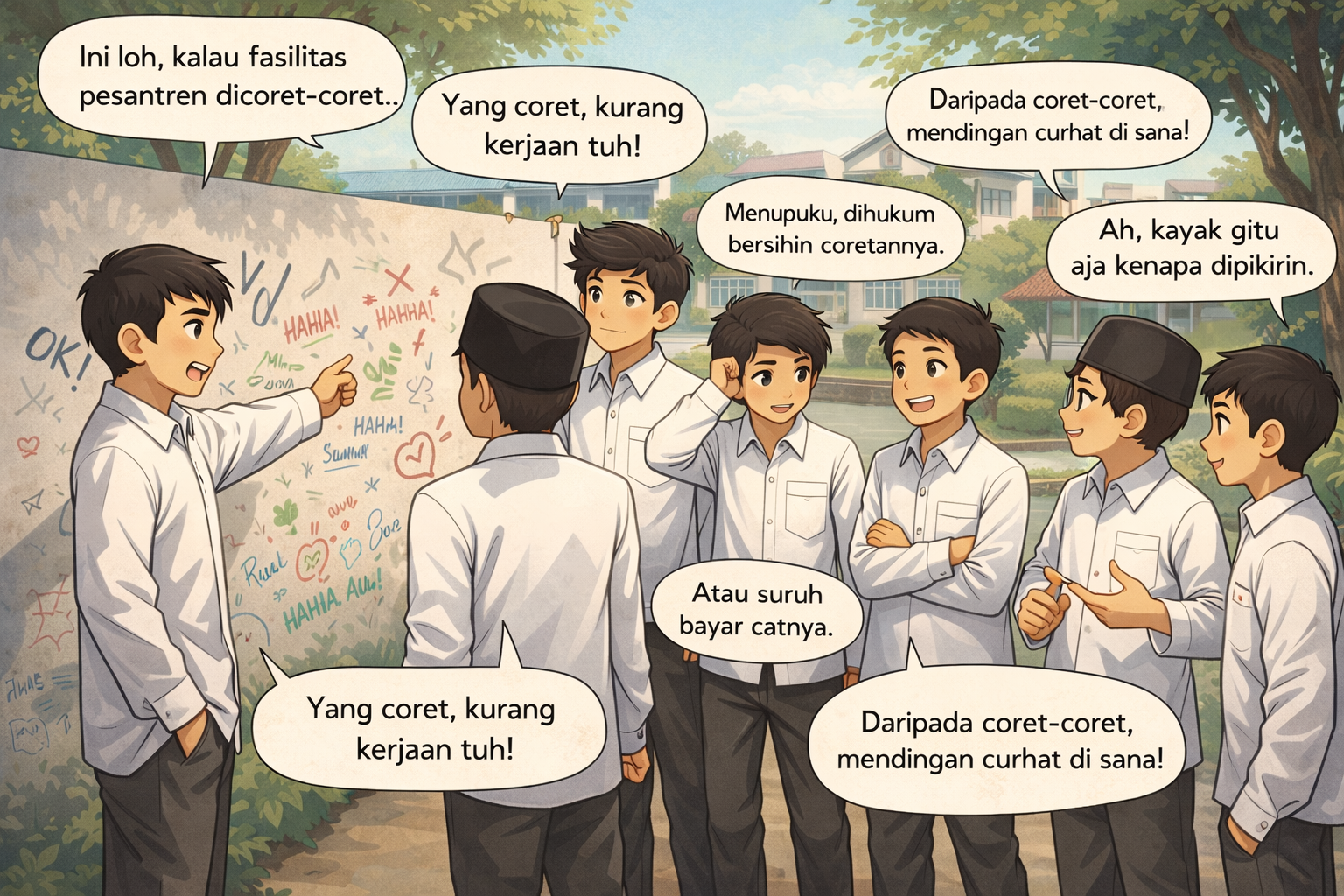 Angin sore berhembus lembut di halaman pesantren. Di depan mereka, tembok yang penuh coretan seakan menjadi pengingat bahwa menjaga amanah bukan hanya tentang belajar kitab, tetapi juga tentang merawat apa yang dimiliki bersama.